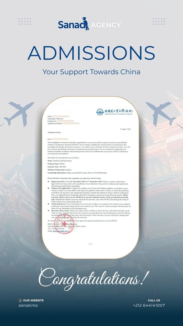 Thanks to Sanad, I got accepted into one of the top universities in China. They prepared my admission file perfectly and gave me clear guidance about visa, dorms, and flight planning. Excellent service!